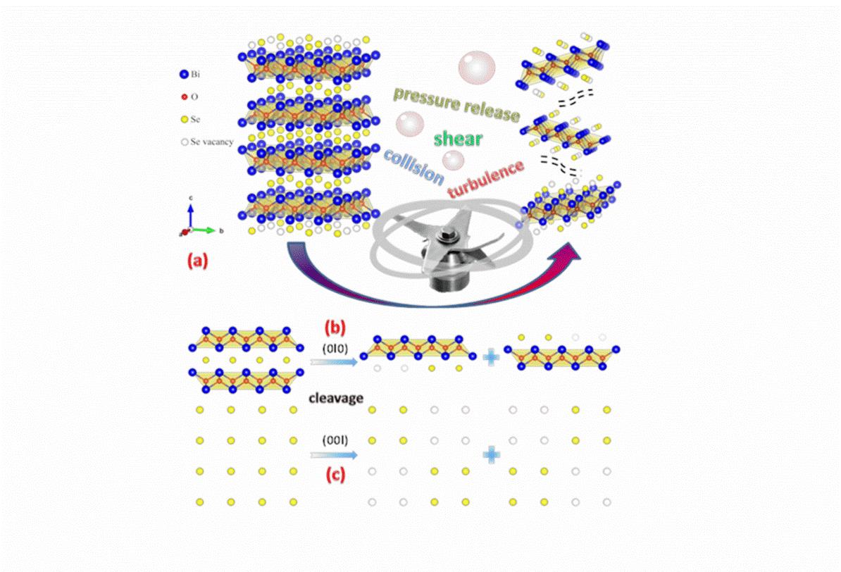 王一峰教授课题组根据二维材料的解理特性,通过家用破壁机在液相中高速剪切Bi2O2Se多晶粉末,发现所制备的纳米片状Bi2O2Se经过烧结,电导率得到显著提升(常温下最高可达到500~600 Scm-1),这主要得益于Bi2O2Se经剪切沿着Se层解理,产生大量的Se空位,并在体系内产生大量电子。热电性能也由此得到明显改善。ACS Appl. Mater. Interfaces 2019, 11, 21603−21609