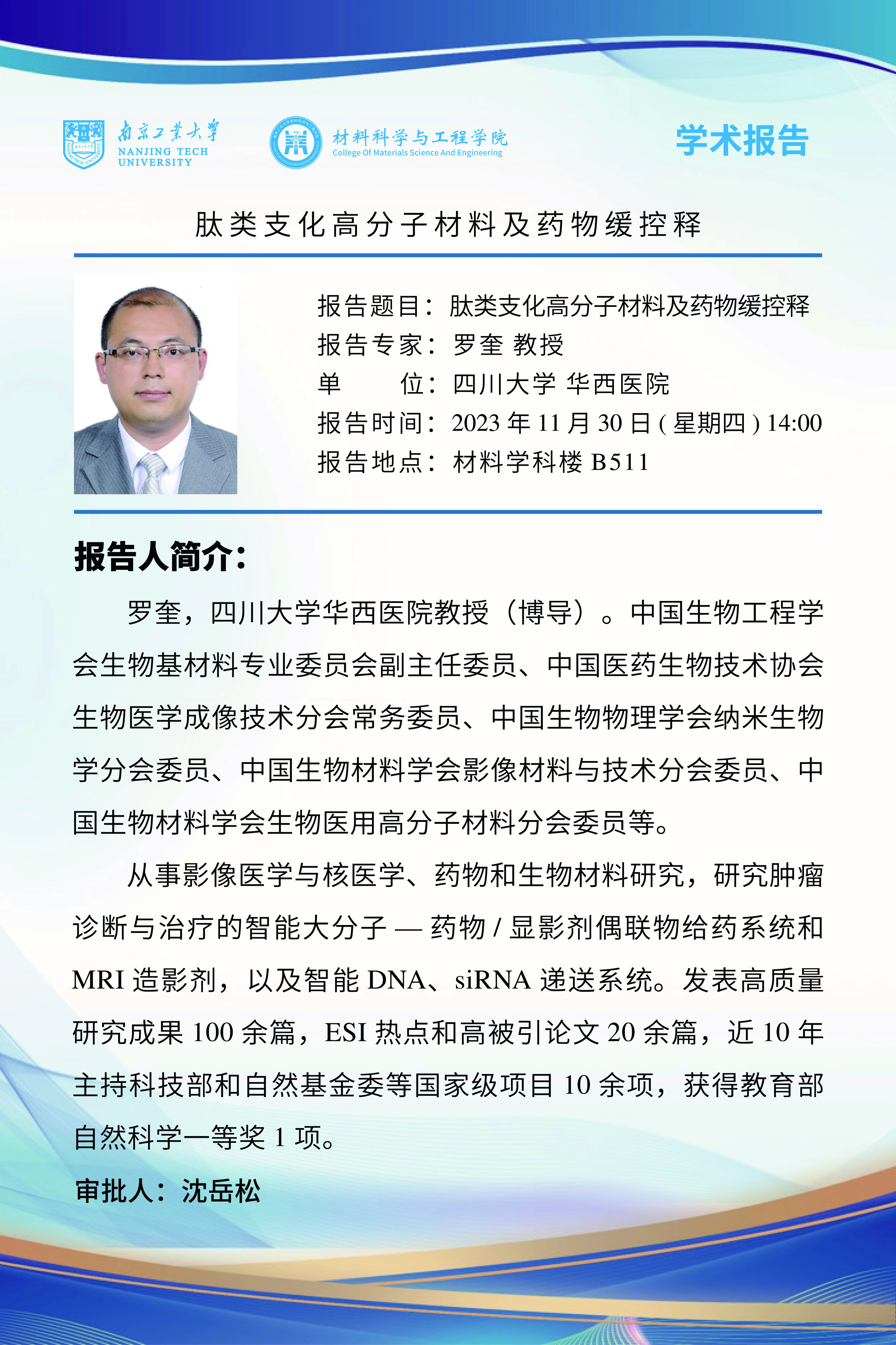 罗奎,四川大学华西医院教授(博导)。中国生物工程学会生物基材料专业委员会副主任委员、中国医药生物技术协会生物医学成像技术分会常务委员、中国生物物理学会纳米生物学分会委员、中国生物材料学会影像材料与技术分会委员、中国生物材料学会生物医用高分子材料分会委员等。