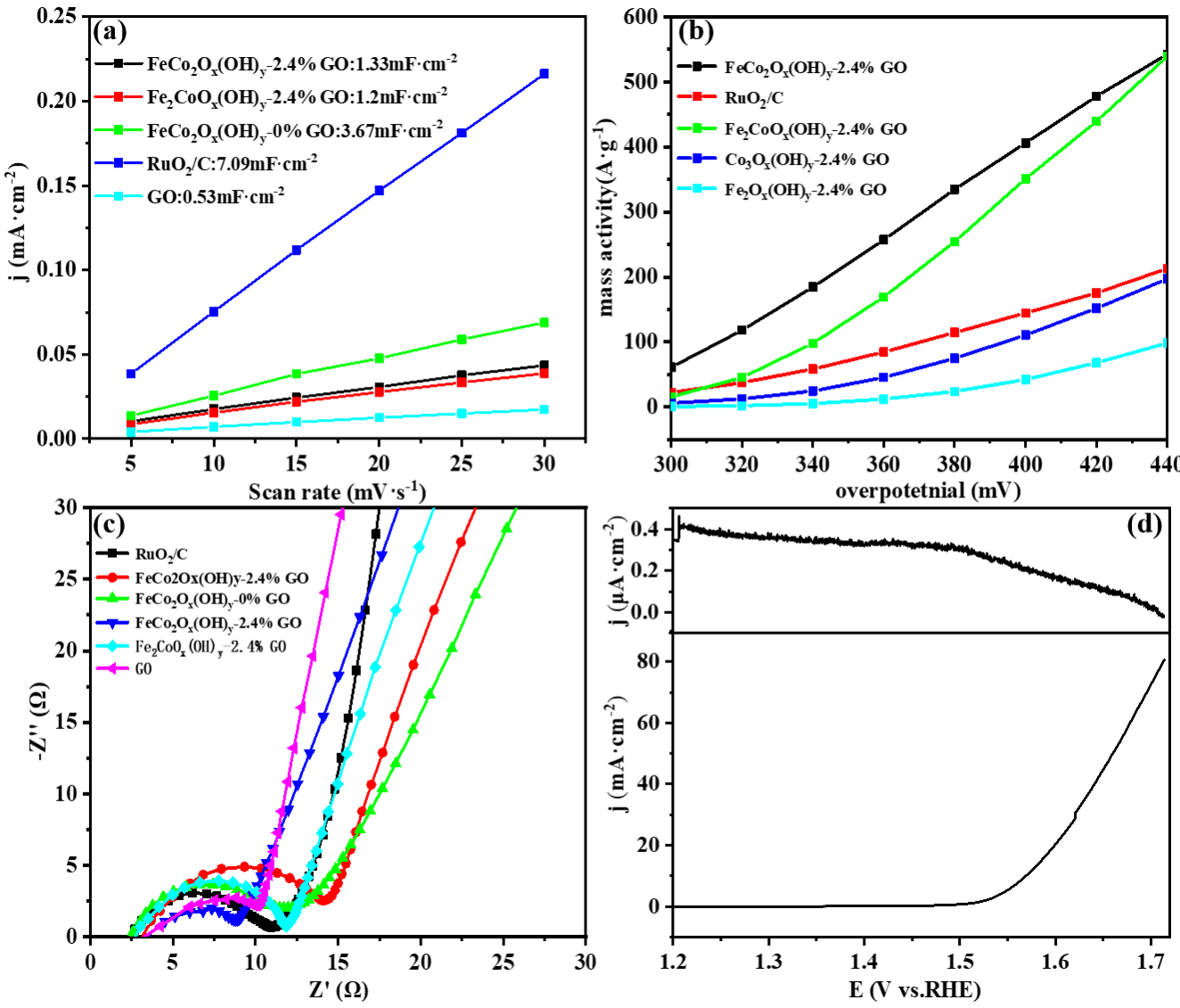 图4(a)电流密度差与扫描速率的斜率图,(b)质量活性,(c)阻抗图,(d)Fe2CoOx(OH)y-2.4%GO催化剂的盘环极化曲线